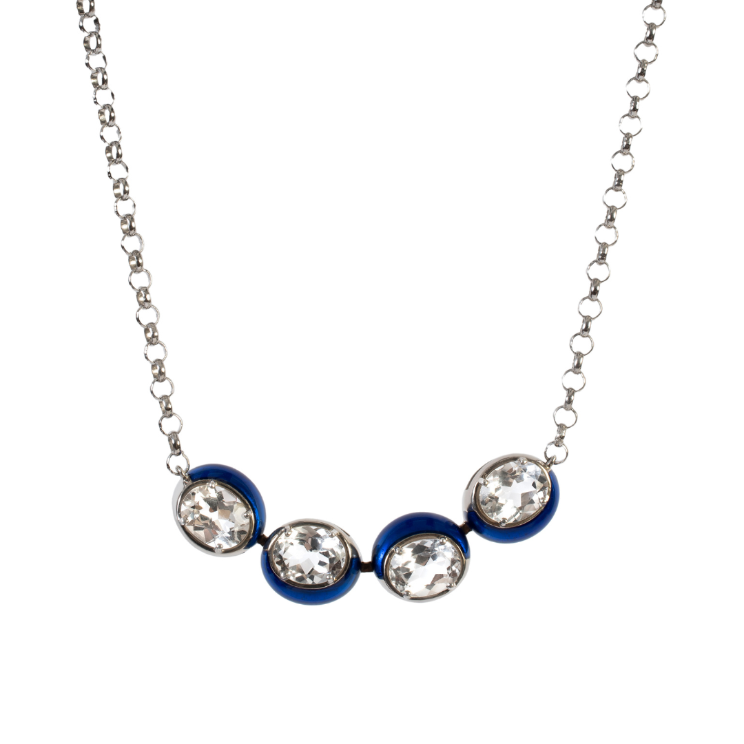 Colar em prata 950 reciclada e purificada, com banho de ródio, esmalte e quatro topázios incolores que captam e refletem a luz com um brilho delicado.